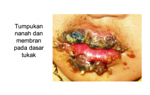 ¥ Terbentuknya lapisan tipis berwarna abu-abu yang menutupi tenggorokan dan amandel.