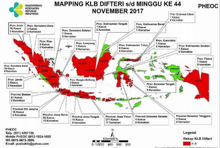 Menurut World Health Organization (WHO), tercatat ada 7.097 kasus difteri yang dilaporkan di seluruh dunia pada tahun 2016. Di antara angka tersebut, Indonesia turut menyumbang 342 kasus. Sejak tahun 2011, kejadian luar biasa (KLB) untuk kasus difteri menjadi masalah di Indonesia. Tercatat 3.353 kasus difteri dilaporkan dari tahun 2011 sampai dengan tahun 2016 dan angka ini menempatkan Indonesia menjadi urutan ke-2 setelah India dengan jumlah kasus difteri terbanyak. Dari 3.353 orang yang menderita difteri, dan 110 di antaranya meninggal dunia. Hampir 90% dari orang yang terinfeksi, tidak memiliki riwayat imunisasi difteri yang lengkap. Pada tahun 2017, Indonesia mengalami Kejadian Luar Biasa (KLB) difteri.