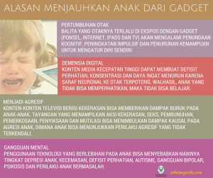Gadget “membunuh” perkembangan anak. Beberapa orang tua tidak meyadari bahwa anak mereka terasing dari alam, tumbuhan, hewan, danau dan langit. Balita harus mampu melemoar bola, melompat, berlari dan bernyanyi. intinya, anak harus aktif bergerak untuk merangsang perkembangan saraf motoriknya.