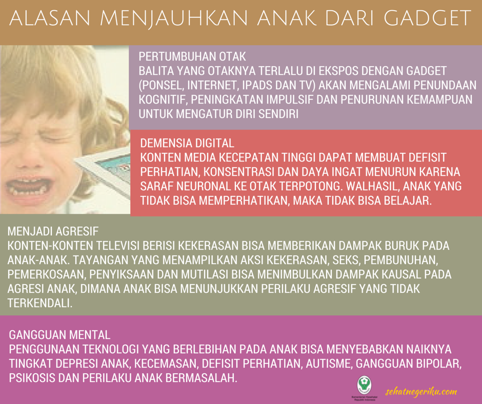 Anak-anak memiliki rasa ingin tahu yang cukup tinggi sehingga ketika melihat orangtuanya menggunakan gadget pasti berusaha untuk meraihnya. Sebagian orangtua terkadang langsung memberikannya supaya si kecil tenang dan tidak rewel. Memang tidak ada salahnya memberikan gadget bagi anak, namun apabila hal tersebut menjadi kebiasaan akan berbahaya bagi si kecil.